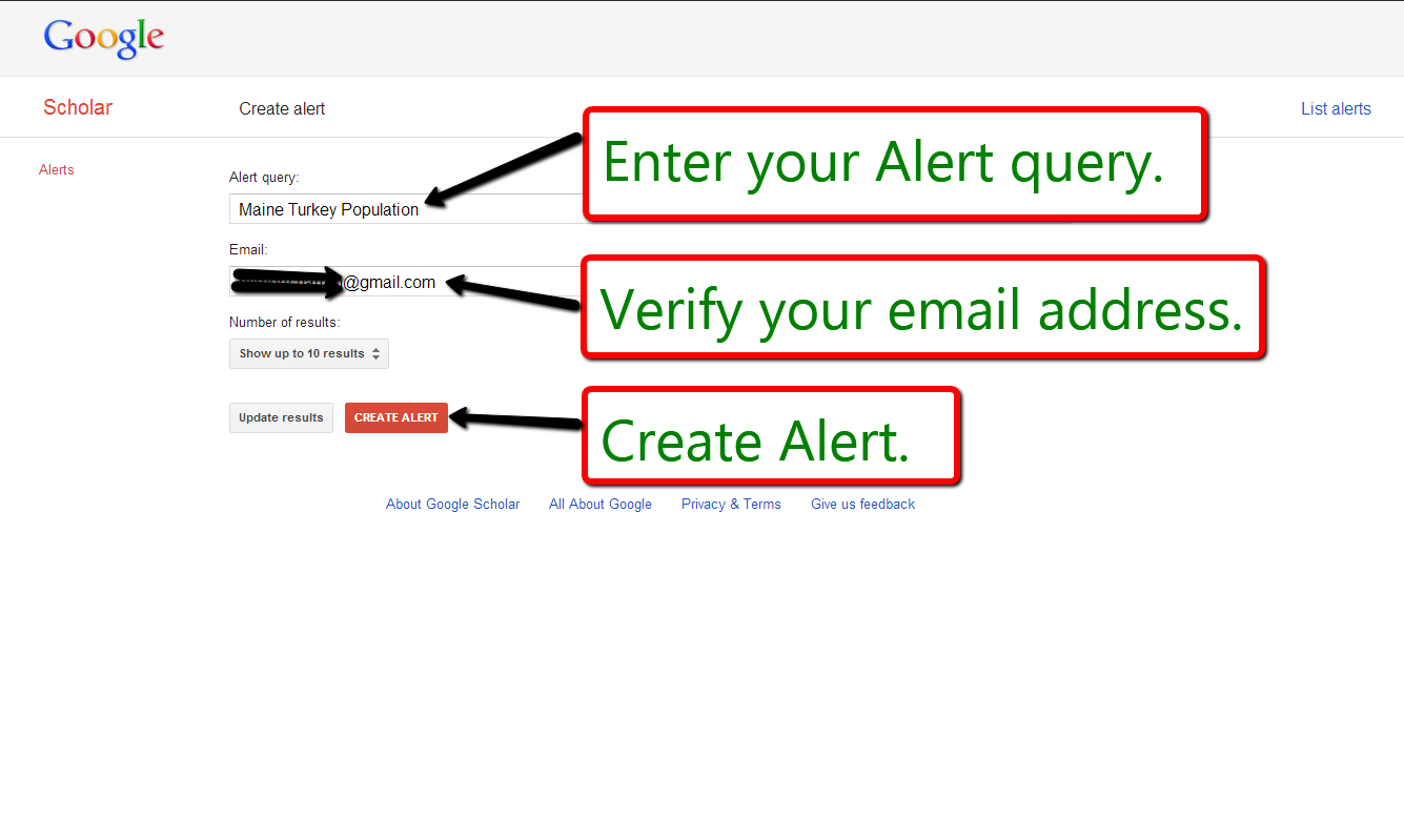 Google Scholar indexes scholarly, peer-reviewed academic papers, journals, theses, books, and court opinions. These are materials that students usually won't find through Google.com, Bing, or Yahoo search. Just they can do for Google.com searches, students can create Google Scholar alerts. Google Scholar alerts notify students when new materials related to their search queries appear on Google Scholar. The screenshots below offer directions for creating Google Scholar alerts. (Click the images to view them in full size).